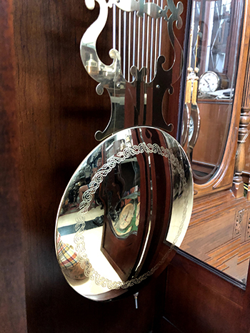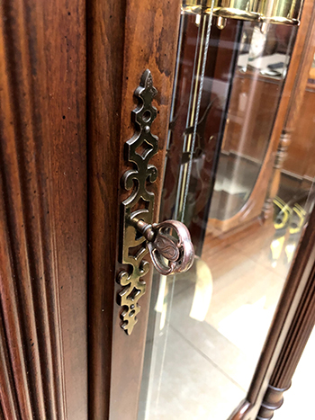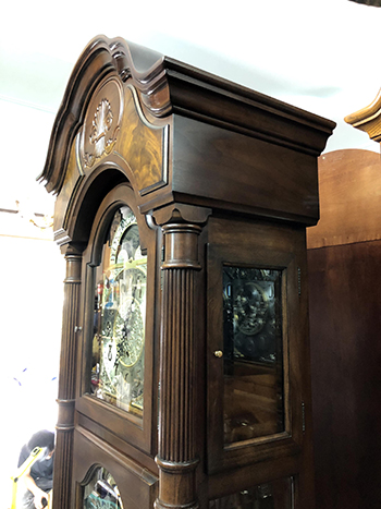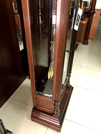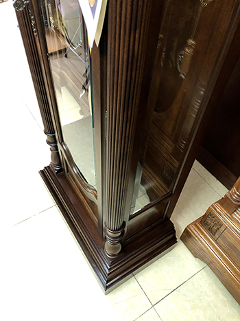 * Ngoại hình: thân vỏ gỗ gụ (Mahogany) nổi vân rất đẹp, 2 cửa kính trên dưới riêng biệt. 2 cửa sổ kính gắn liền. Thiết kế cân đối dễ nhìn, kính dưới hoa văn, mặt số nổi trên dưới 5 kim, tạ lắc đồng bộ soi gương